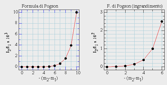 La relazione tra differenza di magnitudine e rapporto di luminosità è mostrata nella tabella e nel grafico seguenti.