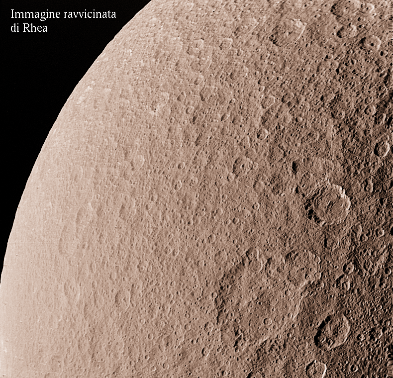 Immagine ravvicinata della superficie di Rhea; si notino dei crateri entro